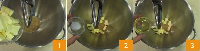 Pour préparer les biscuits rustiques aux pommes, commencez par la pâte : dans un robot versez le sucre de canne et le beurre froid en morceaux 1. Ajoutez également une pincée de sel 2 et le miel d'acacia 3.