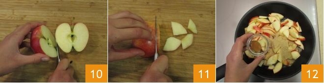 Préparez la garniture : lavez et coupez les pommes d'abord en deux 10 puis en quartiers, retirez-en le cœur et les pépins et réduisez-les en tranches 11. Mettez les pommes dans une poêle avec le sucre et la cannelle 12,