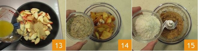 ajoutez également le jus d'orange 13 et faites cuire avec le couvercle pendant environ 5 minutes. Une fois prêtes, transférez-les dans un mixeur avec la farine de noisettes 14 et la farine d'amandes 15.