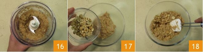 et mixez pendant quelques secondes pour créer un mélange homogène 16. Hachez grossièrement les noisettes et ajoutez-les au mélange obtenu dans un bol 17, mélangez 18 et transférez la garniture dans une poche à douille.