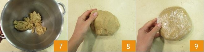et travaillez jusqu'à obtenir une pâte homogène et compacte 7. Transférez-la sur un plan de travail, compactez-la et enveloppez-la dans du film alimentaire (8-9). Laissez reposer la pâte au réfrigérateur pendant au moins 30 minutes.