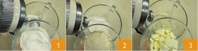 Pour réaliser les candy cane twist cookies, versez dans le bol d'un robot équipé de la feuille 230 g de farine 1, la farine d'amandes 2 et le beurre froid en morceaux 3.