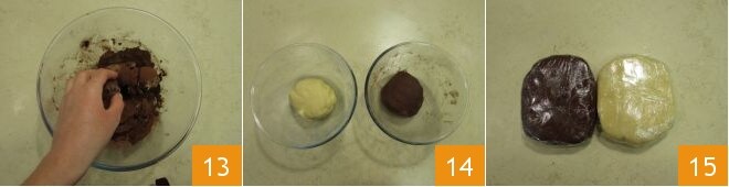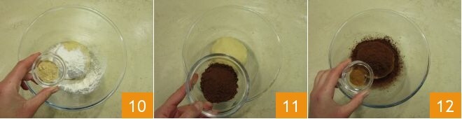 Placez les deux pâtes dans deux bols séparés: dans l'un, ajoutez les 20 g de farine restants et le gingembre en poudre 10 et mélangez pour bien intégrer, dans le second, versez le cacao 11 et la cannelle 12