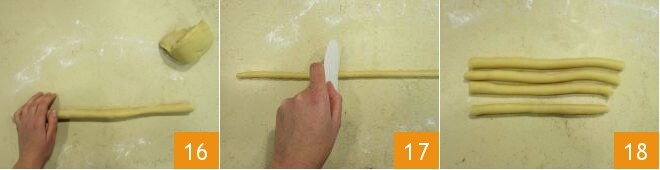 Après le temps de repos, reprenez les pâtons, farinez légèrement le plan de travail et formez avec chaque pâte le même nombre de boudins, d'environ 0,5 cm d'épaisseur 16. Coupez avec une corne chaque boudin pour obtenir des bandes d'environ 15 cm de long (17-18)