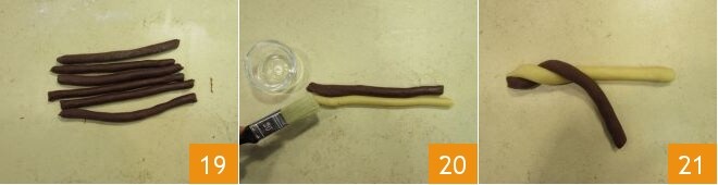 tant blanches que noires 19. Placez les boudins les uns à côté des autres sur un plateau et laissez reposer à nouveau environ 10 minutes au réfrigérateur, couverts de film sans les écraser. Ils doivent être bien froids avant de continuer à les travailler. Après le temps nécessaire, reprenez les boudins, disposez une bande de cacao à côté d'une blanche et avec un pinceau, humidifiez légèrement avec de l'eau l'un des deux 20; essayez ensuite de tresser les deux bâtonnets ensemble 21