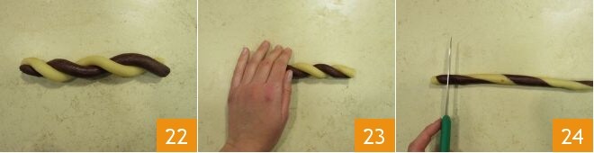 et sans presser, complétez le boudin torsadé 22; placez les boudins bicolores sur un plateau et remettez-les toujours au frigo pour encore 10 minutes. Ce passage permet aussi de rendre les boudins plus maniables. Après le temps de repos, reprenez les boudins bicolores et allongez les extrémités du boudin en travaillant avec vos mains pour intégrer ensemble la pâte blanche et celle au cacao 23. Le boudin doit faire environ 1,5 cm de diamètre, coupez les extrémités avec un couteau 24.