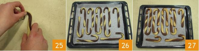 Pliez un côté pour former les classiques bâtonnets de Noël 25. Disposez-les sur une plaque recouverte de papier sulfurisé 26 et faites cuire dans un four statique préchauffé à 170° pendant 15 minutes à mi-hauteur. Une fois la cuisson terminée, sortez les candy cane twist cookies 27 et laissez-les refroidir complètement avant de les servir, de les offrir ou de les accrocher à l'arbre, peut-être avec un petit ruban rouge!