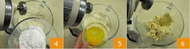 Faites fonctionner la machine pour obtenir une pâte sableuse, ajoutez ensuite le sucre glace 4 et pétrissez pendant environ 1 minute. Ajoutez l'œuf légèrement battu 5 et travaillez la pâte jusqu'à obtenir une consistance douce et lisse 6.