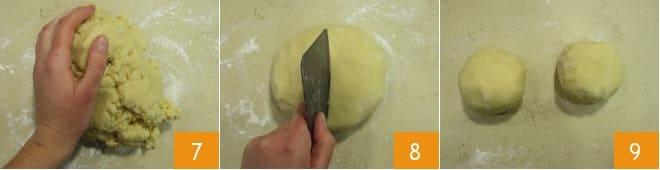 Versez la pâte obtenue sur le plan de travail 7 et travaillez-la pour obtenir une boule homogène. Divisez la boule en deux pâtes de même poids à l'aide d'une corne ou d'un couteau (8-9).