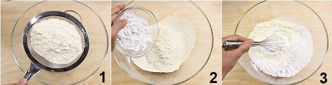 Pour préparer les biscuits type krumiri, préchauffez le four à 200°, tamisez la farine 0 dans un grand saladier 1, puis ajoutez le sucre glace 2, la pulpe prélevée de la gousse de vanille et une pincée de sel : mélangez bien tous les ingrédients à l'aide d'un fouet 3.
