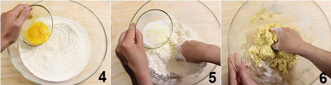 Séparez maintenant les blancs d'œufs des jaunes et faites fondre le beurre dans une petite casserole à feu doux. Ajoutez les jaunes d'œufs 4 et le beurre fondu 5 au mélange, puis commencez à pétrir avec les mains jusqu'à obtenir une pâte lisse et compacte 6.