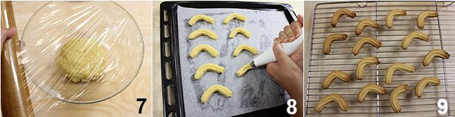 Formez une boule, couvrez-la de film alimentaire 7 et laissez-la reposer pendant une demi-heure à température ambiante. Une fois le temps écoulé, remplissez avec la pâte obtenue une poche à douille en toile (ou une seringue en plastique) avec une douille étoilée, en mettant peu de pâte à la fois et en l'assouplissant toujours avec les mains. Sur une plaque recouverte de papier sulfurisé, formez des biscuits en forme de croissant, d'environ 7-8 cm de long 8. Enfournez le tout à 200° pendant 16 minutes, ou jusqu'à ce que les biscuits soient dorés ; une fois prêts, laissez-les refroidir sur une grille 9.