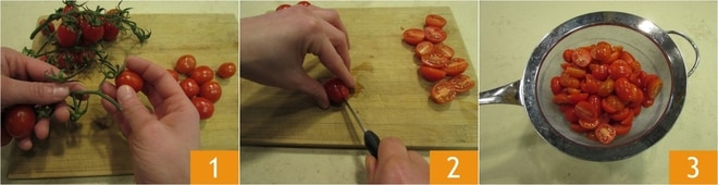 Pour préparer le blanc de poulet à l’orange, commencez par les tomates cerises. Détachez-les des brins puis rincez-les 1, ensuite, coupez-les en deux 2 et placez-les dans une passoire posée à l’intérieur d’un bol, de cette façon, l'excès de liquide s'écoulera au fond 3.
