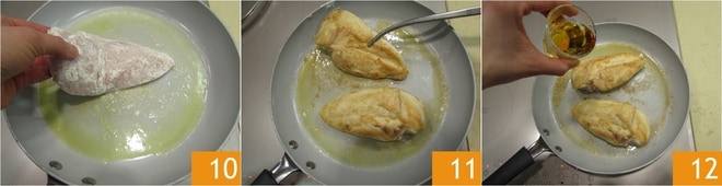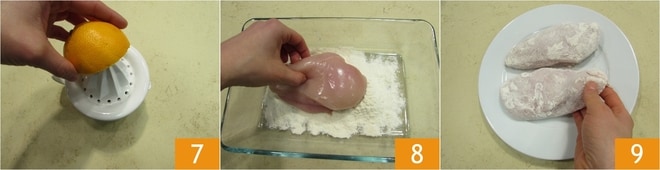 En attendant, occupez-vous du reste : coupez en deux l’orange et extrayez-en le jus, si vous le souhaitez, vous pouvez aussi le filtrer pour éliminer d’éventuels résidus de pulpe ; mettez de côté 7. Prenez ensuite le blanc de poulet entier, divisez-le en deux et nettoyez-le des éventuels résidus de gras et de cartilages. Farinez bien les 2 morceaux 8 et secouez-les pour éliminer l’excès de farine 9.