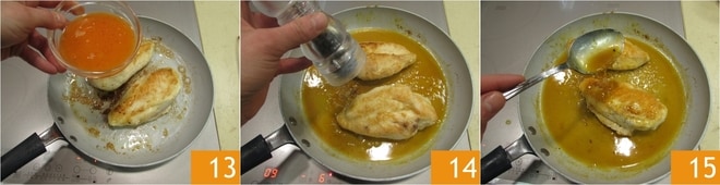Dès que l’alcool sera complètement évaporé, cela prendra environ 1 minute, ajoutez également le jus d’orange 13 et laissez cuire en arrosant avec le jus et en retournant de temps en temps. Laissez cuire pendant 10-15 minutes et à mi-cuisson, assaisonnez également avec du sel et du poivre (14-15).