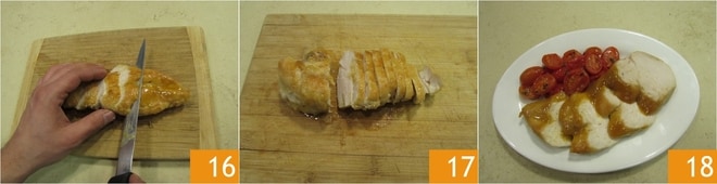 Une fois prêts, placez les blancs de poulet sur une planche à découper ou une assiette 16 et coupez-les en biais pour obtenir ainsi des tranches d'environ 2 cm d’épaisseur 17. Garnissez avec les tomates cerises et voici votre blanc de poulet à l’orange prêt : dégustez encore très chaud 18 !