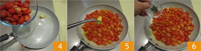 Dans une poêle, chauffez l’huile d’olive extra vierge avec une gousse d’ail en chemise (rappelez-vous de la presser un peu avec la paume de la main avant), puis ajoutez les tomates cerises 4 et laissez-les sauter quelques minutes. Assaisonnez avec du sel et du poivre et laissez cuire encore quelques minutes, puis retirez la gousse d’ail 5. Lorsque les tomates cerises seront légèrement fanées, environ 5 minutes de cuisson en tout, vous pourrez éteindre le feu et ajouter les feuilles de thym 6.