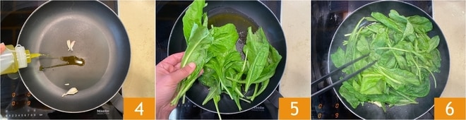 Dans une grande poêle, versez l'huile et l'ail en chemise écrasé 4, puis laissez infuser à feu moyen. Ajoutez les blettes petit à petit 5 et mélangez 6.