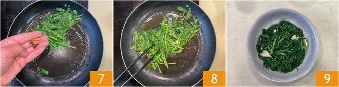 Cuisez pendant environ 10 minutes jusqu'à ce qu'elles soient tendres et flétries. À ce moment, relevez le goût avec le piment séché 7 et le sel, puis mélangez et cuisez encore quelques minutes 8. Transférez-les dans un plat et, si vous le souhaitez, retirez les gousses d'ail. Vos blettes à la poêle sont prêtes à être servies 9 !