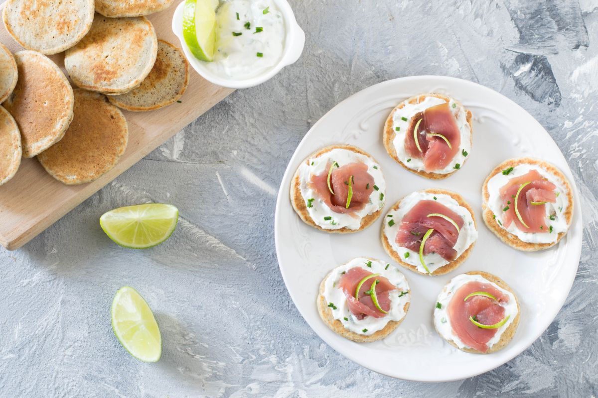 Un apéritif parfait pour ceux qui cherchent une recette sans gluten à offrir comme amuse-bouche pour un dîner entre amis : les blinis au sarrasin avec thon fumé sont des portions individuelles au goût riche, idéales pour ceux qui sont intolérants et ne veulent pas renoncer au goût, mais irrésistibles aussi pour tous les autres. Le fromage de chèvre se marie parfaitement avec le thon fumé et ensemble, ils rendent cette variante des Blinis un finger food appétissant à déguster en compagnie. La farine de sarrasin avec son goût plein, son arrière-goût de fruits secs et sa note rustique offre une base parfaite pour accueillir la garniture gourmande mais en même temps raffinée.
