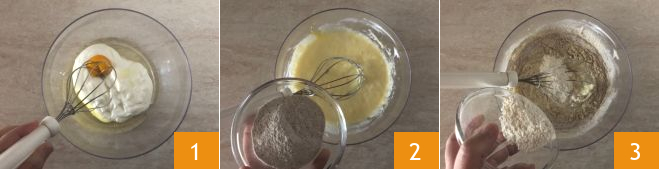 Pour préparer les blinis au sarrasin avec thon fumé, versez le yaourt et l'œuf dans un bol et mélangez-les avec un fouet 1, ajoutez la farine de sarrasin 2 et la fécule 3; continuez à mélanger.