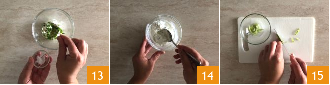 ajustez le sel 13, mélangez 14. Épluchez un morceau de lime et coupez la peau en fines lamelles 15.