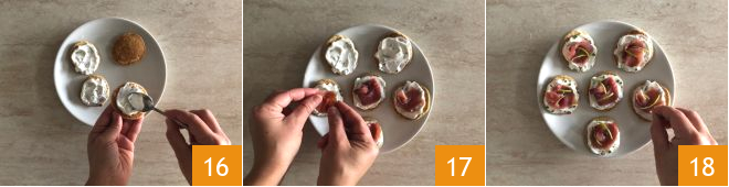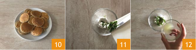 Reprenez les blinis et étalez chacun avec la crème de fromage 16, déposez les tranches de thon fumé 17 et décorez avec les lamelles de lime et un peu de ciboulette 18. Les blinis au sarrasin avec thon fumé sont prêts 18.