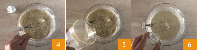 Ajustez le sel 4, versez le lait en filet 5 mélangez encore, ajoutez la levure instantanée 6 et mélangez le tout une dernière fois.