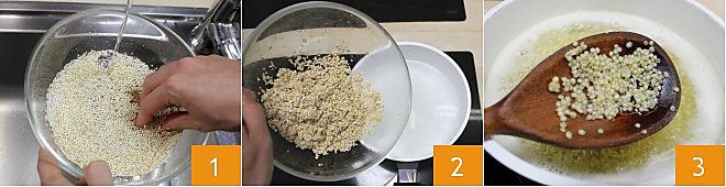 Pour préparer les bouchées de quinoa, commencez par mettre le quinoa dans un bol et rincez-le sous l'eau froide jusqu'à ce que l'eau soit claire. De cette façon, vous éliminerez les traces de saponines (la fine couche de résine externe) présentes sur les grains, qui leur donnent un goût amer 1. Faites ensuite cuire le quinoa dans une poêle antiadhésive avec de l'eau salée pendant le temps indiqué sur l'emballage (environ 15-20 minutes) 2, jusqu'à ce que les grains aient absorbé la majeure partie de l'eau de cuisson, se ramollissant et gonflant 3.