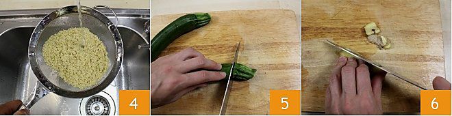 Poursuivez en égouttant le quinoa et en le passant sous l'eau froide pour arrêter la cuisson 4. À ce stade, lavez soigneusement les courgettes et épluchez-les 5. Ensuite, épluchez et nettoyez également le gingembre frais 6.