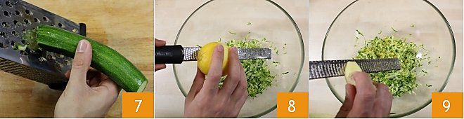 Râpez les courgettes et mettez-les dans un grand récipient 7, où vous ajouterez le zeste de citron râpé 8 et le gingembre frais râpé 9.