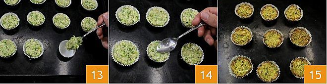 Passez à la disposition des caissettes en papier mignon (d'un diamètre d'environ 4-5 cm et d'une hauteur d'environ 3 cm) sur une plaque de cuisson et remplissez-les avec le mélange 13; vous pouvez également utiliser un moule antiadhésif pour mini muffins. Gardez à l'esprit que chaque caissette sur la photo contient environ 20 g. Compactez le mélange à l'intérieur des caissettes à l'aide du dos d'une cuillère pour mieux définir la forme des bouchées 14. Il ne vous reste plus qu'à les mettre au four préchauffé en mode statique à 180° pendant 25 minutes (si vous utilisez un four ventilé, cuisez-les à 160° pendant 20 minutes), jusqu'à ce que la surface atteigne une agréable dorure 15. À ce stade, les bouchées de quinoa sont prêtes à être servies et dégustées tièdes !