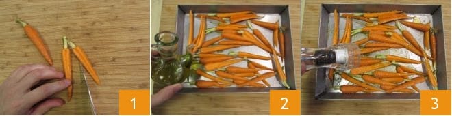 Pour préparer la tagliata de bœuf aux deux currys, commencez par les carottes d'accompagnement. Lavez-les et coupez-les en deux dans le sens de la longueur 1. Disposez-les ensuite dans un plat et assaisonnez avec du sel, de l'huile 2, du poivre noir 3