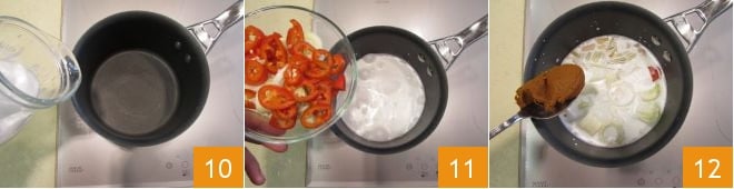 Dans une casserole, versez le lait de coco 10, ajoutez le piment, la citronnelle et le poireau 11. Allumez le feu, ajoutez la pâte de curry jaune 12, mélangez le tout