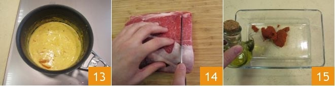 et laissez cuire à feu doux pendant environ 7 minutes 13. Pendant ce temps, prenez le morceau de viande et coupez-le en 4 tranches de 200 g chacune, épaisses d'environ un centimètre ou deux 14. Versez ensuite dans un plat peu profond la pâte de curry rouge, l'huile 15 et le sel.