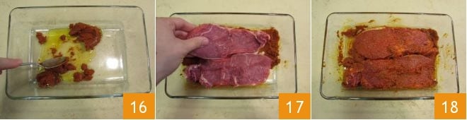 Mélangez avec une cuillère 16 pour dissoudre la pâte. Placez ensuite les tranches de viande à l'intérieur 17 et retournez-les de l'autre côté 18, pour les imprégner des deux côtés.