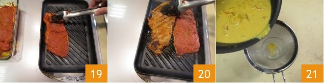 Chauffez bien une grille et dès qu'elle est chaude, déposez dessus les tranches de viande 19. Attendez quelques minutes et retournez-les 20. Faites-les cuire encore quelques minutes et pendant ce temps, chauffez et filtrez la sauce au lait de coco 21.