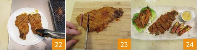 Dès que la viande est grillée de l'autre côté 22, transférez-la sur une planche à découper et coupez-la en lanières 23. Disposez les carottes sur une feuille de laitue, saupoudrez la viande de persil haché et servez avec la sauce au lait de coco 24.
