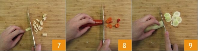 Passez à la sauce. Nettoyez et coupez en morceaux la citronnelle 7, le piment 8 et le poireau 9.