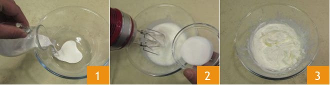 Pour réaliser le bombardino, commencez par monter la chantilly : versez la crème froide dans un bol 1 et commencez à la monter avec un fouet électrique tout en ajoutant progressivement le sucre 2 jusqu'à obtenir une consistance ferme et solide 3. Transférez la chantilly dans une poche à douille avec une buse étoile.