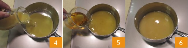 Maintenant, versez le Vov dans une petite casserole 4 et faites-le chauffer à feu doux pendant 5 minutes, puis ajoutez le brandy 5 et éteignez le feu, en faisant légèrement tourner la poêle pour mélanger 6.