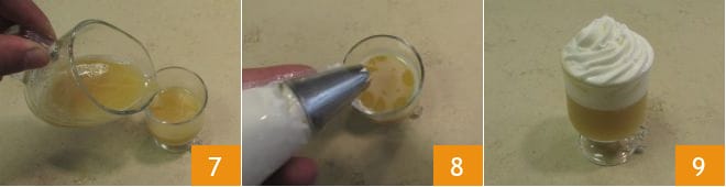 Remplissez les verres avec la liqueur pour environ deux tiers 7, puis ajoutez la chantilly 8. Votre bombardino est prêt à être dégusté 9 !