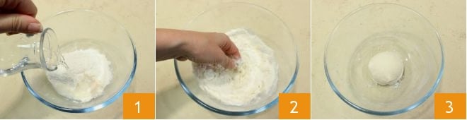 Pour préparer les bombes frites, commencez par le levain : dans un bol, versez la farine Manitoba tamisée, la levure de bière déshydratée et l'eau à température ambiante 1. Vous pouvez aussi utiliser de la levure de bière fraîche : dans ce cas, la dose est de 3 g. Travaillez le mélange avec les mains 2 et formez une boule 3 que vous pouvez laisser lever dans un four éteint avec la lumière allumée pendant 2 heures, couverte avec un film plastique.