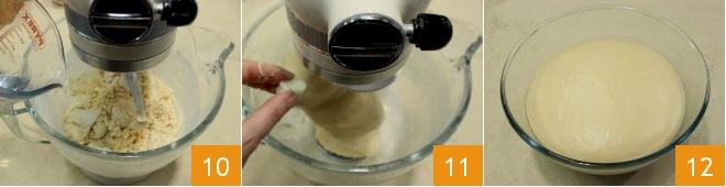 Versez l'eau à température ambiante 10 et enfin le sel, puis continuez à travailler les ingrédients avec la feuille ; lorsque la pâte sera bien amalgamée, retirez la feuille et montez le crochet. Ensuite, pétrissez encore pendant environ 15 minutes, puis ajoutez le beurre ramolli en morceaux petit à petit, en attendant que le premier morceau soit absorbé avant de passer au suivant 11. Lorsque vous aurez incorporé tout le beurre, la pâte sera lisse et homogène, vous pouvez arrêter le robot pâtissier. Renversez la pâte sur le plan de travail et formez une boule, puis beurrez légèrement un bol et placez la pâte à l'intérieur 12 : couvrez avec un film plastique et laissez lever dans un four éteint avec la lumière allumée pendant 2 heures (ou couverte avec une couverture en laine).