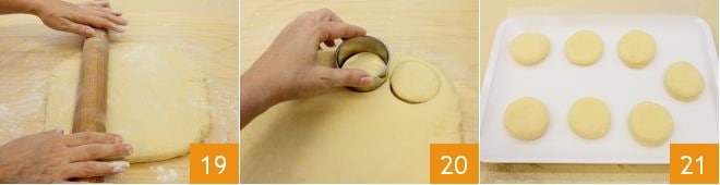 Après le temps nécessaire, reprenez la pâte et étalez-la sur un plan de travail légèrement fariné en un rectangle d'environ 2,5 cm d'épaisseur 19. Avec un emporte-pièce de 6,5 cm de diamètre, découpez les disques 20 ; vous pourrez pétrir de nouveau les chutes et laisser lever la pâte environ 30 minutes avant de réaliser d'autres formes : au fur et à mesure que vous réalisez les disques, déposez-les sur un plateau recouvert de papier sulfurisé 21 : avec ces doses, vous obtiendrez 24 disques. Laissez-les lever pendant environ une demi-heure dans le four éteint avec la lumière allumée.