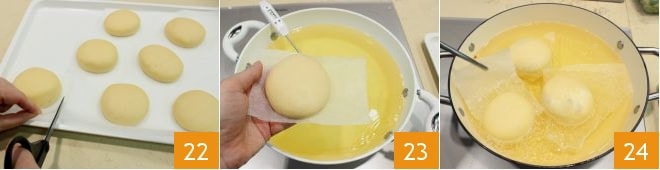 Ensuite, découpez un carré de papier sulfurisé autour de chaque disque 22 et faites frire quelques disques à la fois dans une huile de graines d'arachide abondante 23, portée à une température de maximum 175-180° (vous pouvez la mesurer avec un thermomètre de cuisine). Une fois les disques immergés dans l'huile, retirez le papier sulfurisé avec une pince de cuisine 24