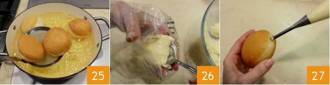 et retournez de temps en temps les bombes pour les faire dorer et gonfler uniformément. Lorsqu'elles seront dorées, égouttez-les à l'aide d'une écumoire 25 et déposez-les sur un plateau recouvert de papier absorbant. Pendant que les bombes refroidissent légèrement, mettez la sauce Mornay dans une poche à douille avec une buse à seringue 26, puis farcissez une à une les bombes frites salées avec la sauce 27 et servez-les encore chaudes ou légèrement réchauffées au four !