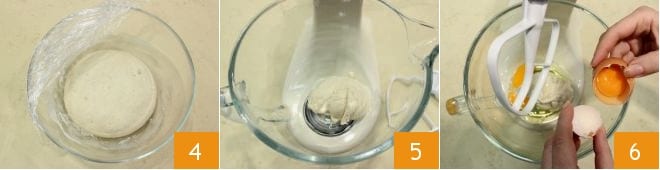 Après les deux heures, le levain aura doublé de volume 4, puis versez-le dans le bol d'un robot pâtissier 5 (ou dans un bol si vous pétrissez à la main) équipé d'une feuille et ajoutez les œufs 6
