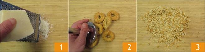 Pour préparer les bombettes de poulet cacio e pepe, commencez par râper le pecorino 1. Ensuite, écrasez grossièrement les taralli avec un pilon 2 pour les réduire en miettes et réservez-les 3.