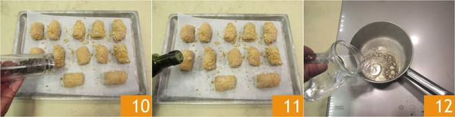 Déposez-les sur une plaque recouverte de papier sulfurisé, poivrez 10 et arrosez d'un filet d'huile 11. Faites cuire dans un four ventilé préchauffé à 200°C pendant environ 20 minutes, en retournant les bombettes à mi-cuisson. Pendant que les bombettes sont au four, préparez la sauce : dans une petite casserole, faites griller du poivre noir déjà moulu pendant quelques minutes, une fois le poivre grillé, versez l'eau et éteignez le feu 12.